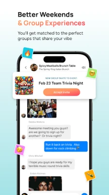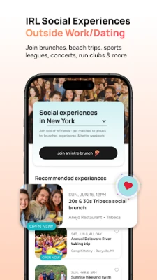 Get matched with the perfect groups who match your interests - adventure buddies, foodies, singles, artists, entrepreneurs, couples, etc. You can create an account for free to start meeting people outside work and dating apps doing in-person activities you love.