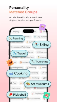 - You're added to groups that fit your personality/preferences, whether you're looking to meet travel buddies, singles, friends to go to concerts with, couples to bar hop with, nerdy science people, etc.